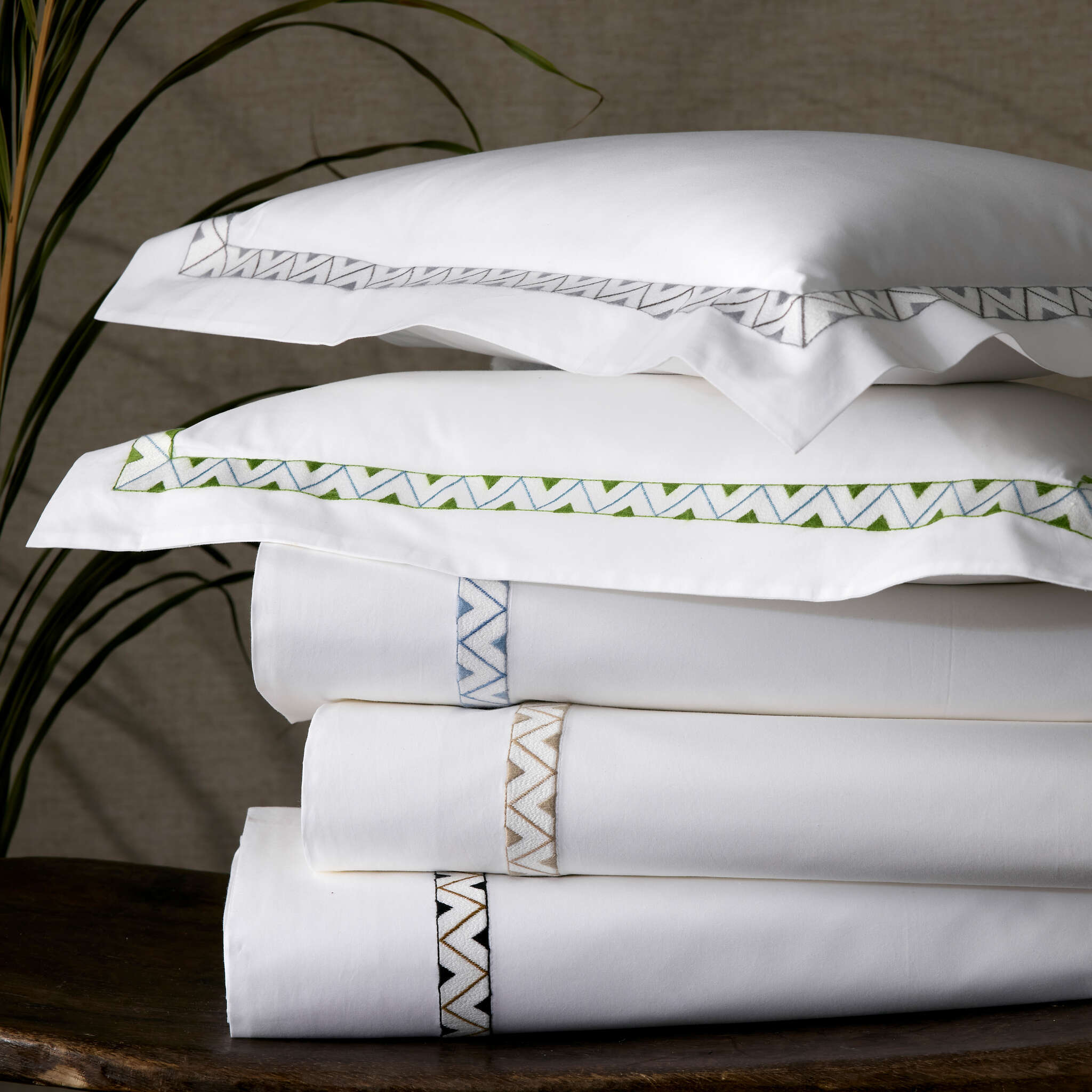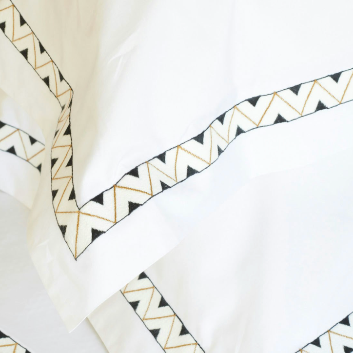 Prado creatively combines a chic Schumacher design and a classic Matouk construction, with breathtaking results. We’ve placed the Prado pattern on our crisp Ceylon percale as we would a tape detail, but here the pattern is fully embroidered instead. The finished product has a crisp, tailored look with a delicious pop of colorful decoration.