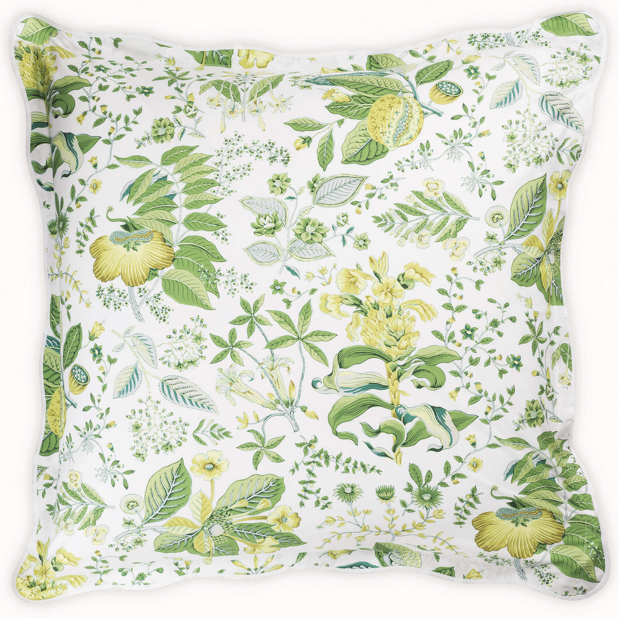 Pomegranate Bedding by Matouk. An 18th Century Botanical pattern from the Schumacher Design Archive. Printed on Luca 100% Cotton Percale Sheeting and finished with a Subtle Scallop.