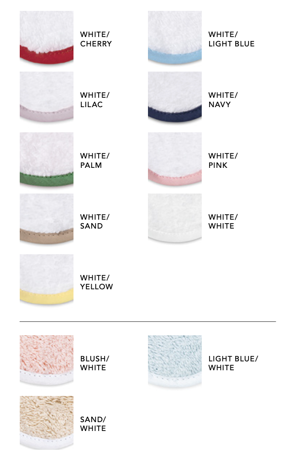 In the Cairo collection, a simple design is simply beautiful. Its pure, plush long-staple cotton terry is unadorned but for a 100% cotton piped edge, in a straight construction. You can opt for white trimmed with a pop of color or a natural tone with piping to match.