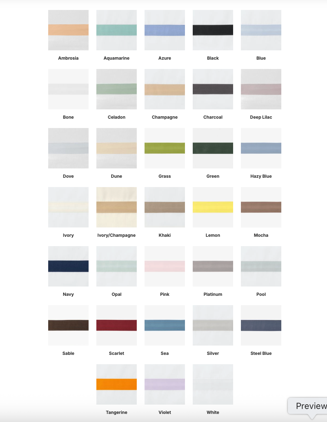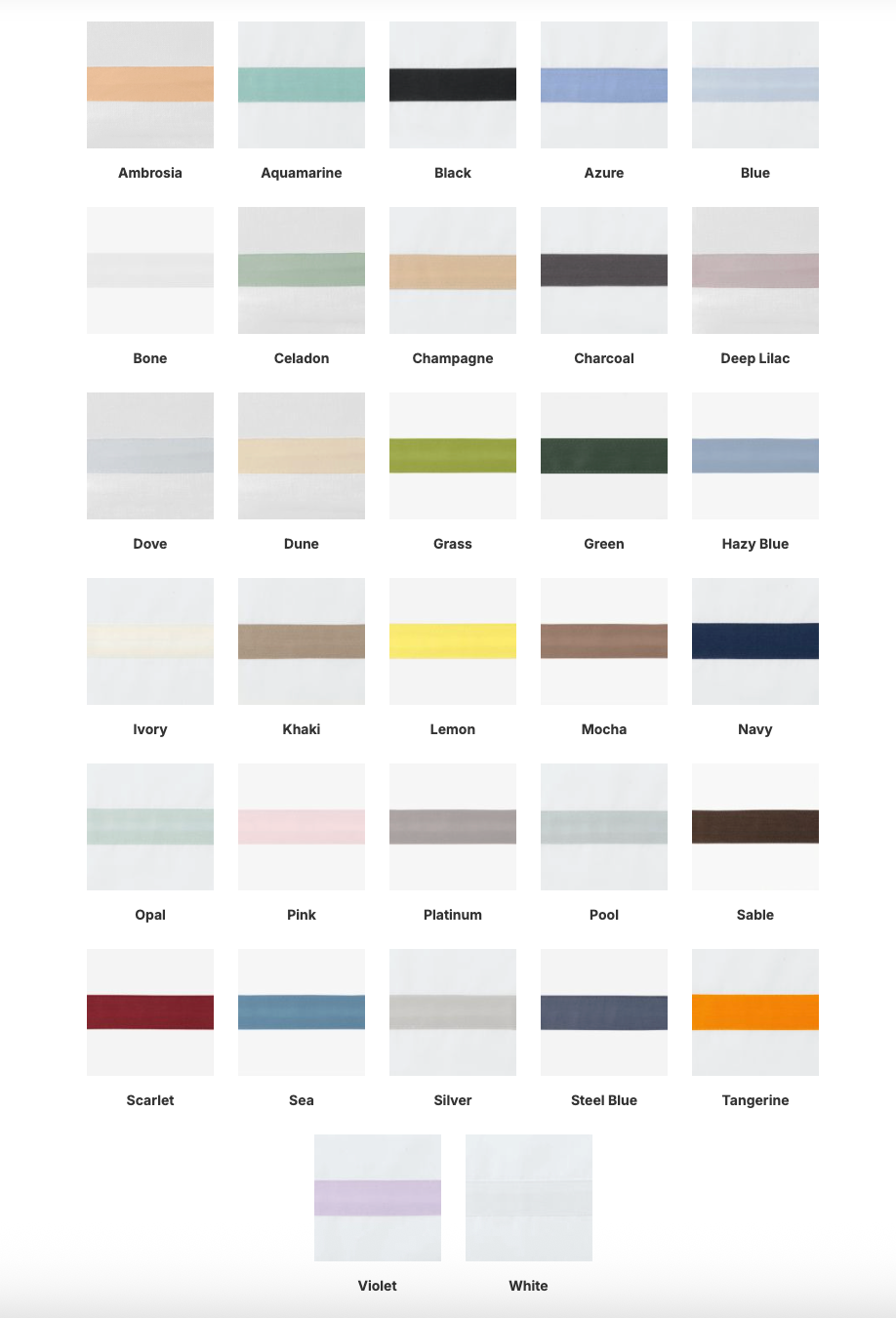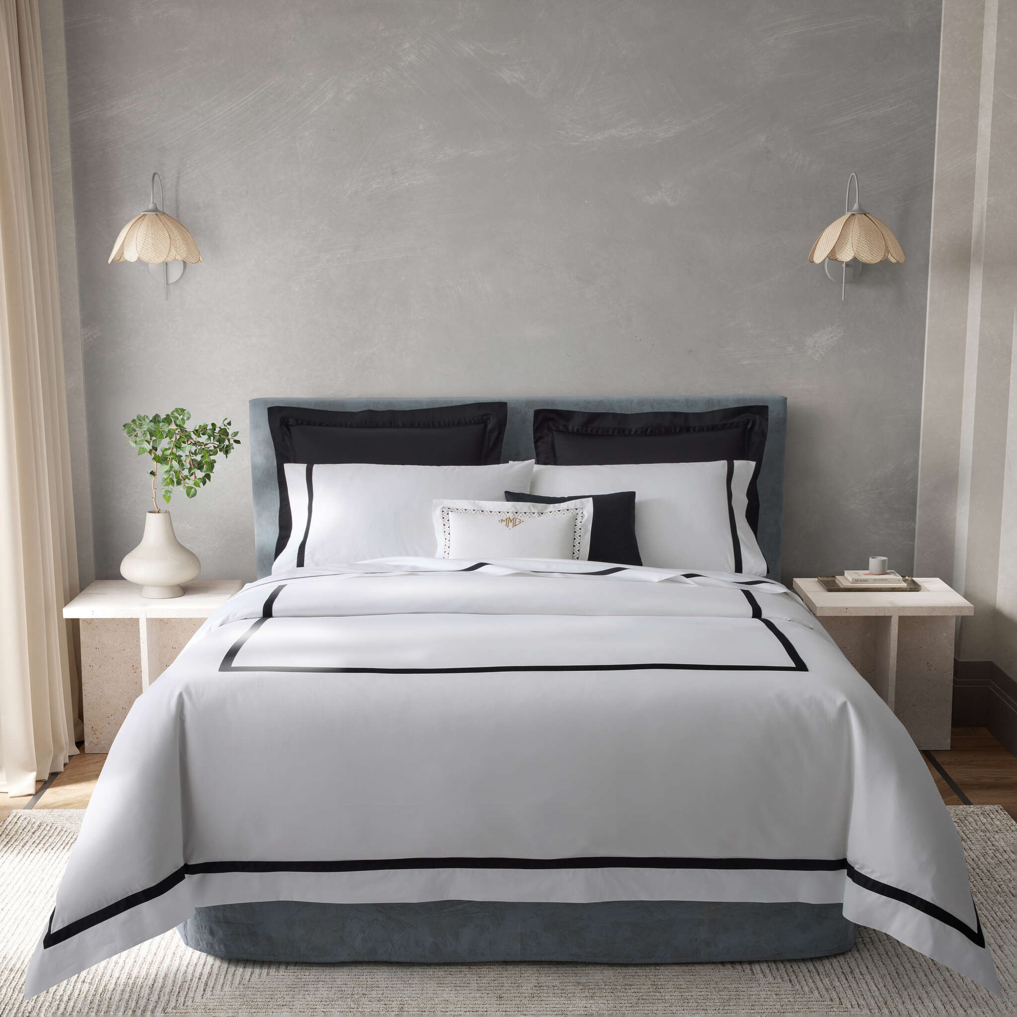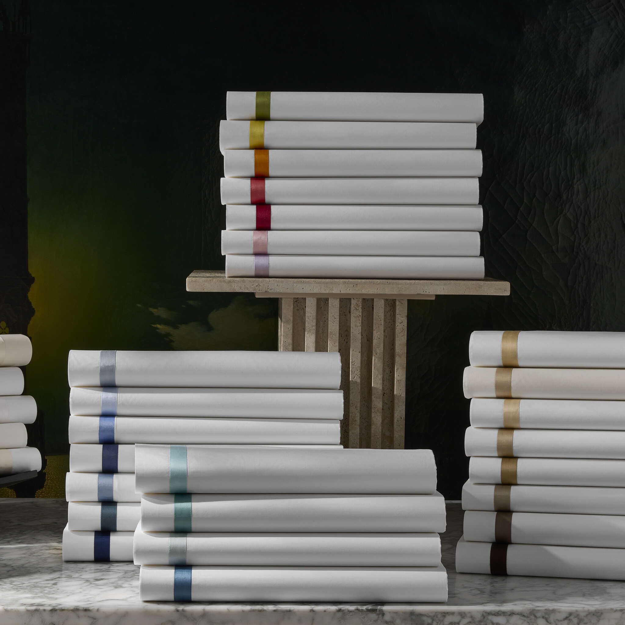 Matouk’s iconic, best selling style is the elegantly modern bedroom must-have. Our classic white or ivory Milano percale sheeting is smartly adorned with a 1” Nocturne sateen tape border in an array of colors to capture any look or mood from subtle neutrals to bold black and brights.