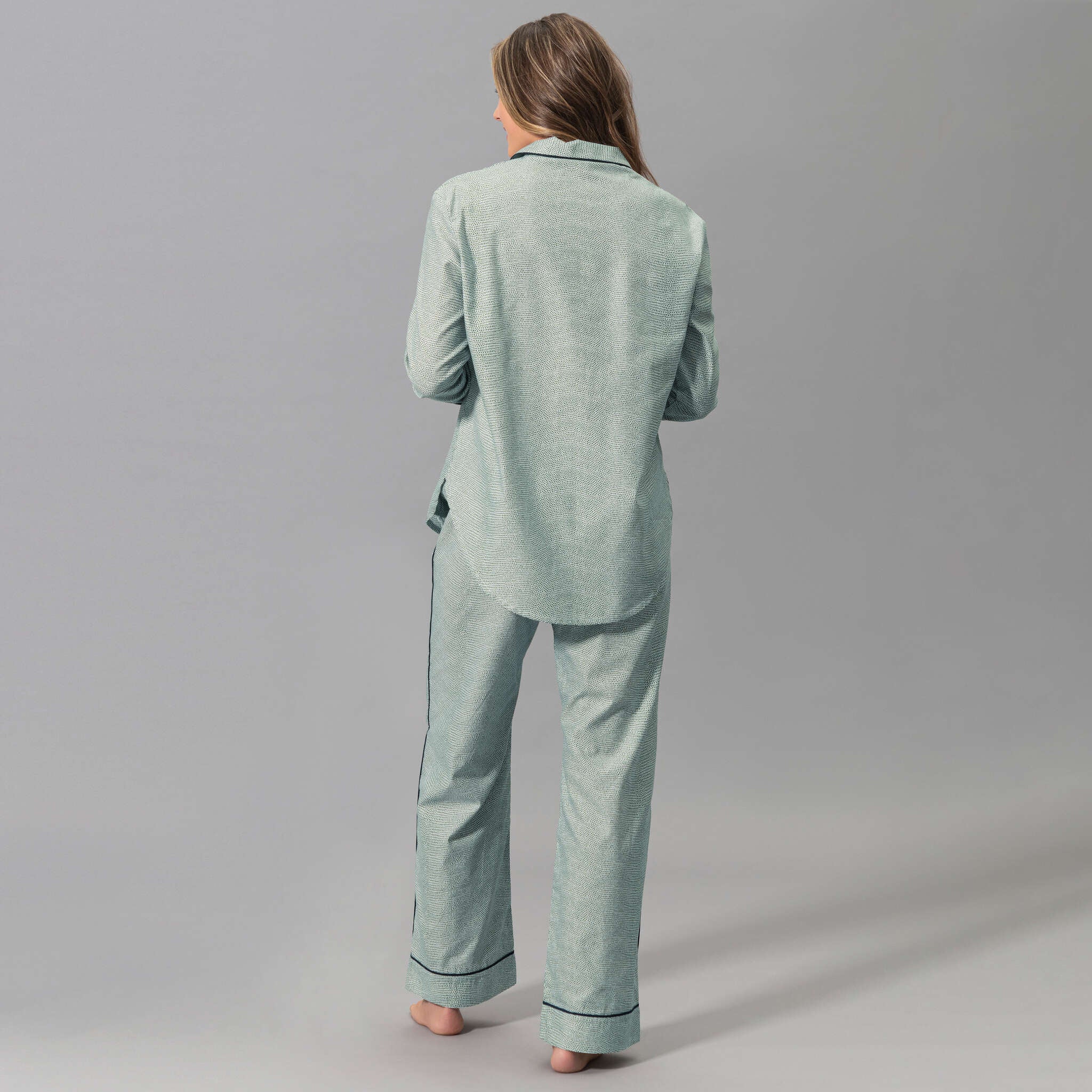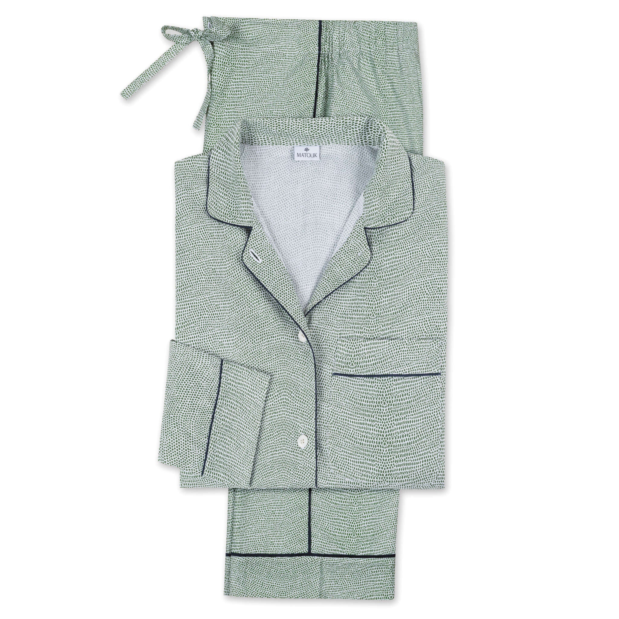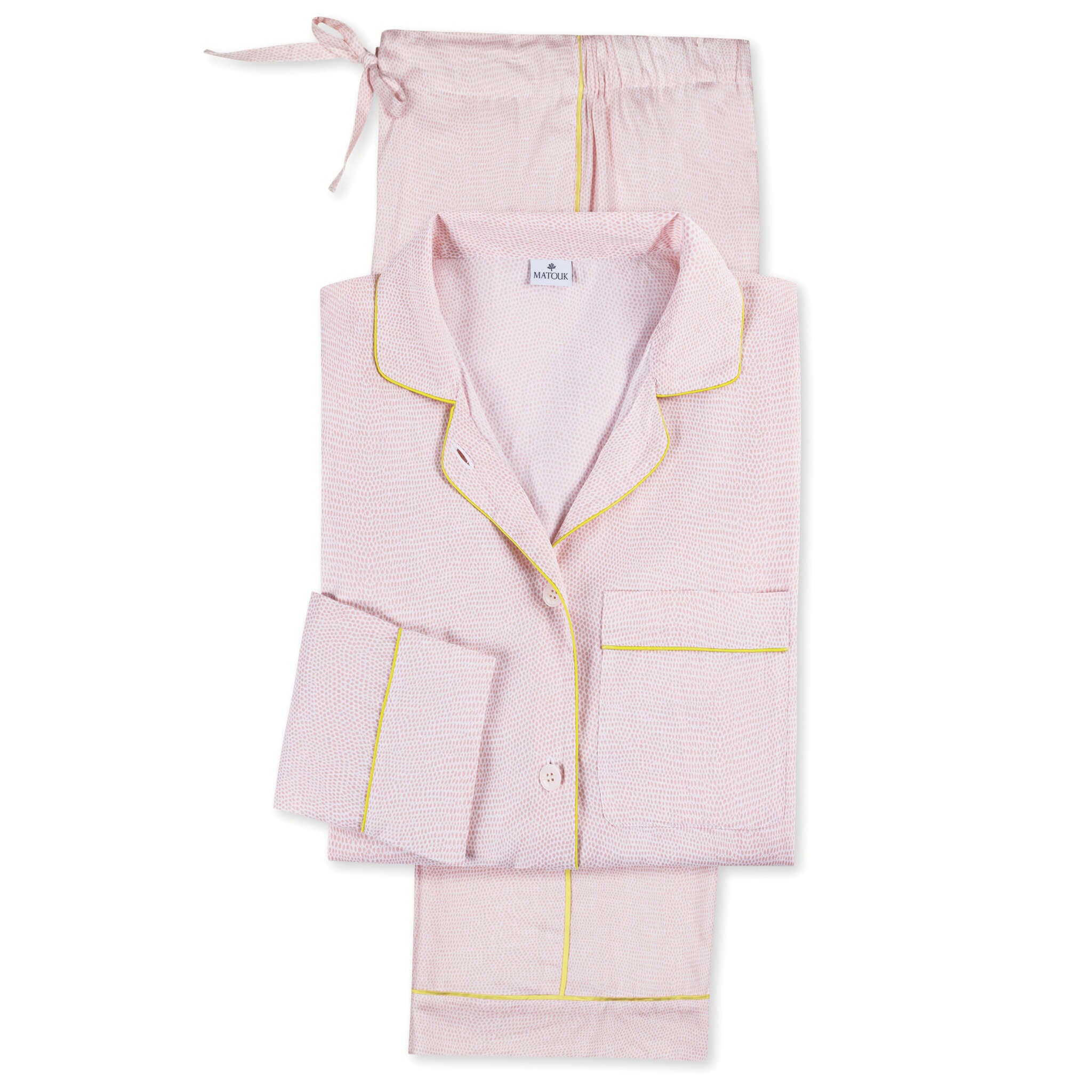 Crafted from our dreamy Luca cotton percale in a range of vibrant Schumacher prints, we’ve combined the luxury of Matouk sheeting with the comfort of your favorite lived-in dress shirt. The top features natural corozo buttons, piped details, and a scooped hem. The drawstring trousers have elastic in the back for extra comfort and a flattering fit. Beautifully tailored, these pajamas are just as chic outside the house as they are in the bedroom.