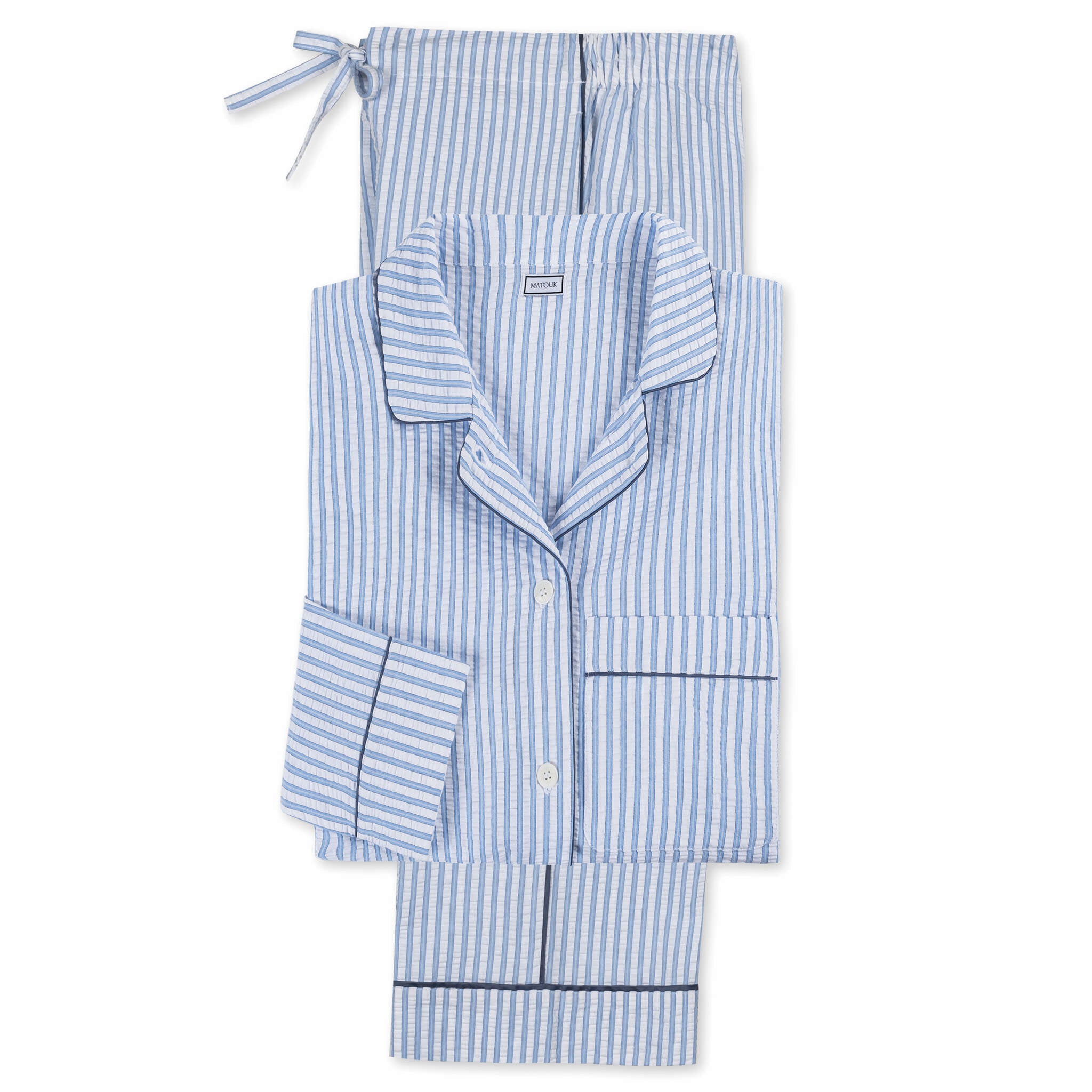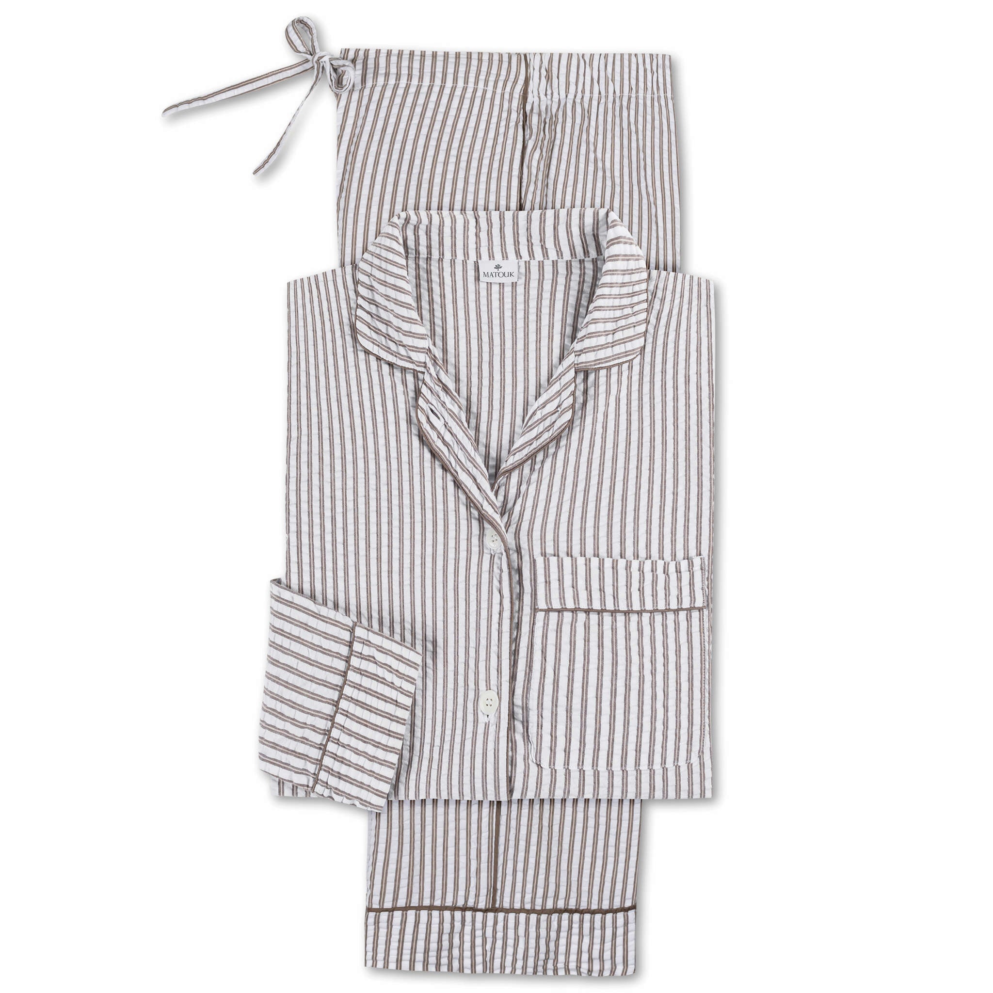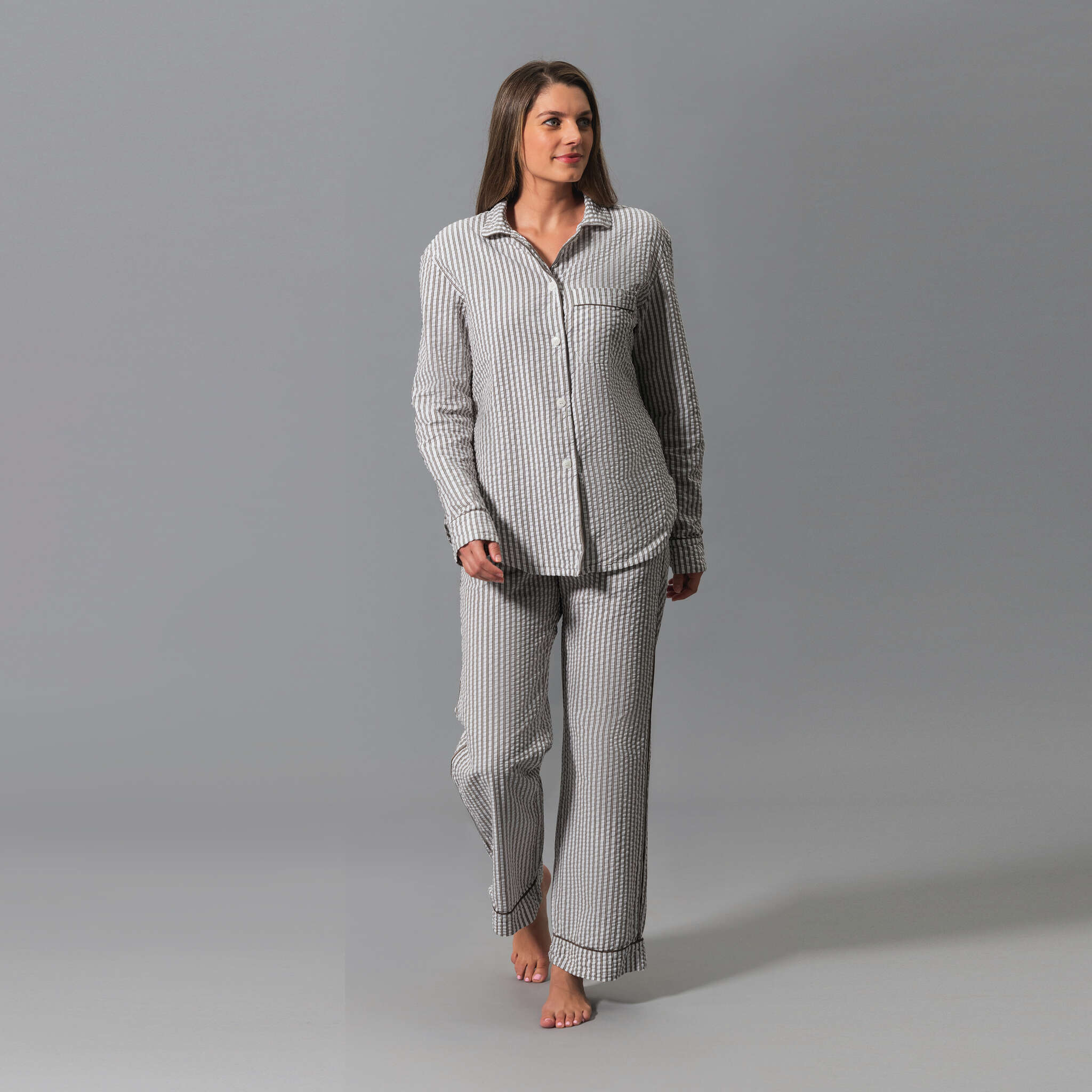 Elevate your loungewear with our Matteo pajamas, featuring a button-down shirt and drawstring pant in lightweight seersucker cotton. This classic striped look adds sophistication to leisurely nights and mornings, and looks just as great out of the house as it does curled up at home.