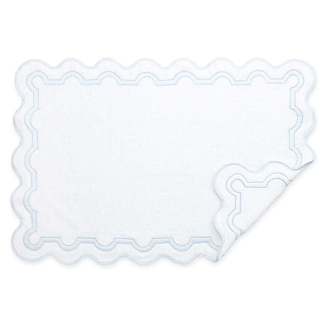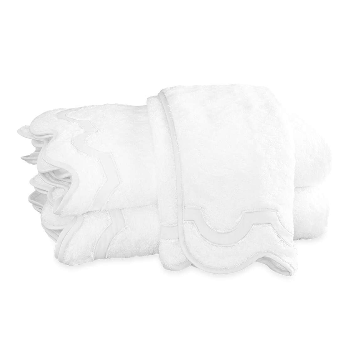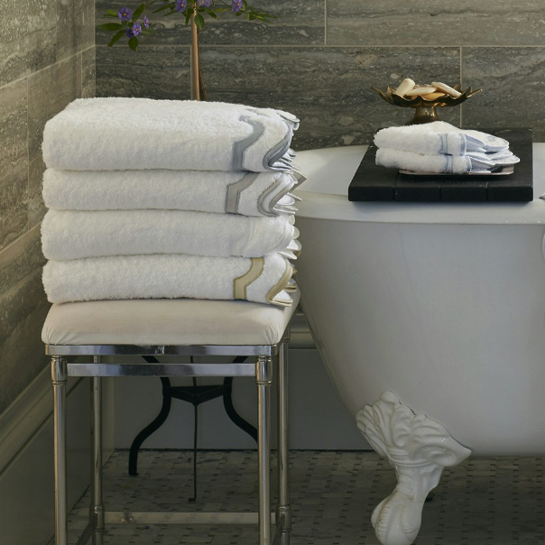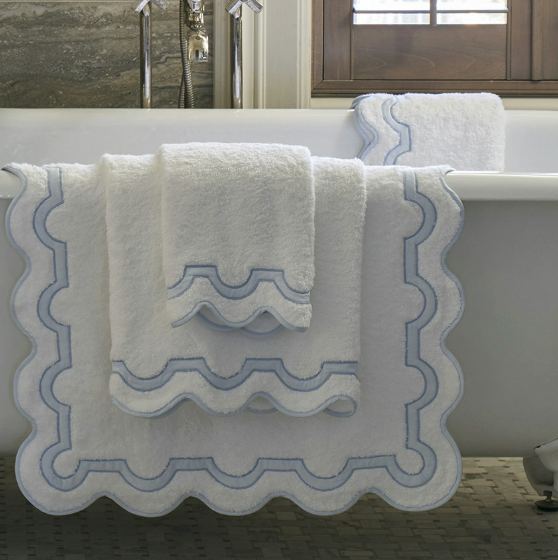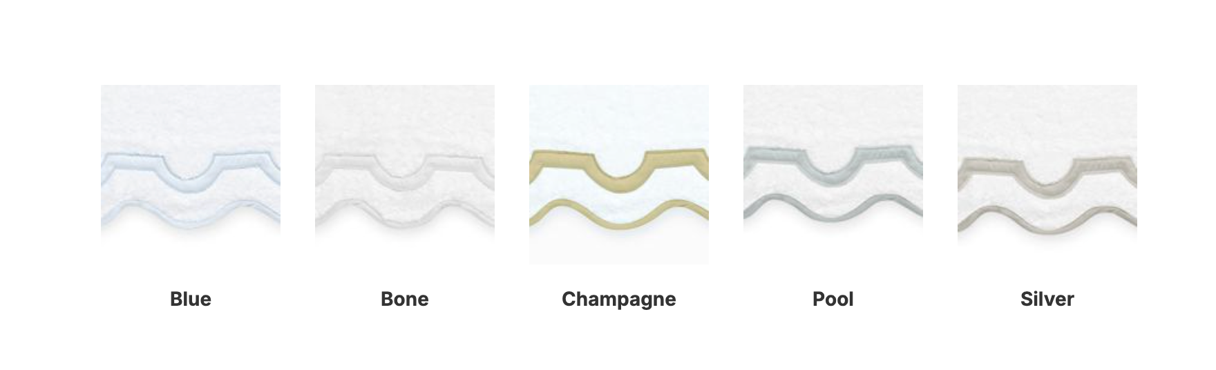 A chic shop awning in Palm Beach inspired the motif that unites our Mirasol collections. For the bath, the border is an appliqué of our Nocturne sateen in either Champagne or Silver, with a scallop piping to finish. It's a detail that lends our Cairo cotton terry towels and diamond pique shower curtain a perfect touch of glamour.
