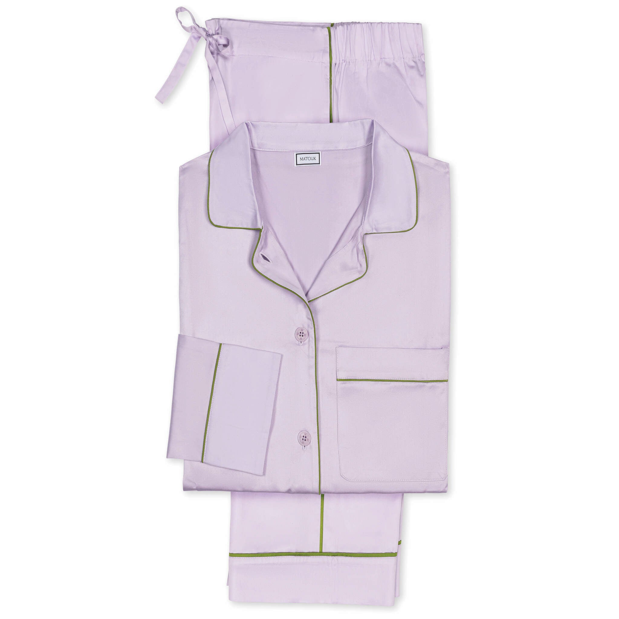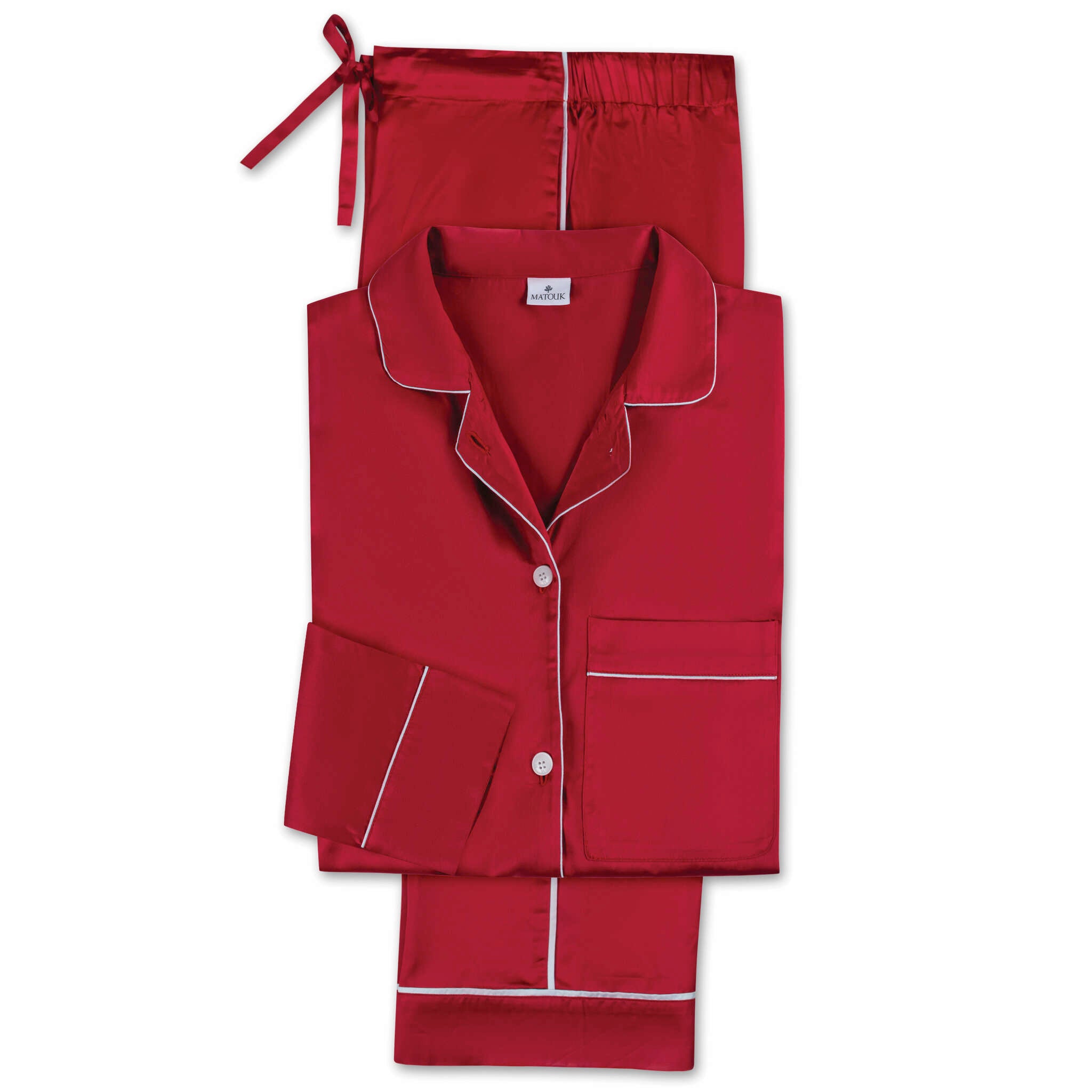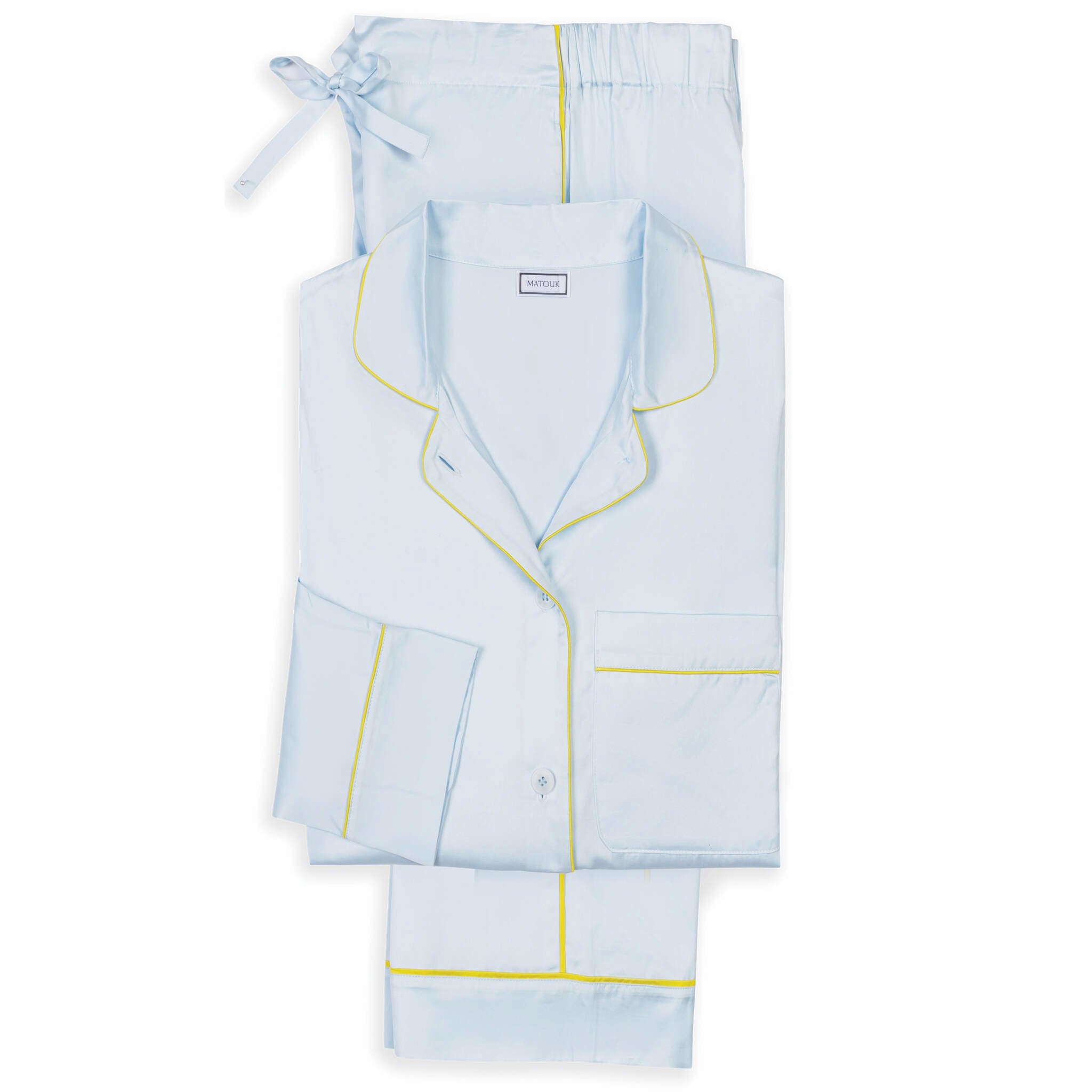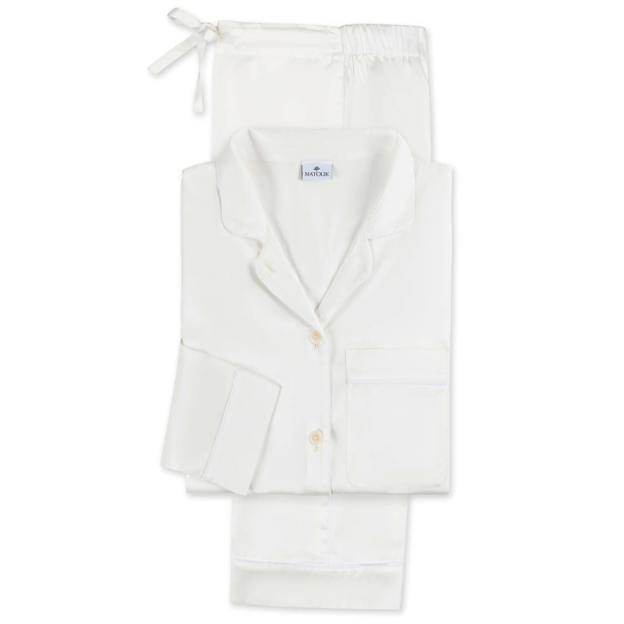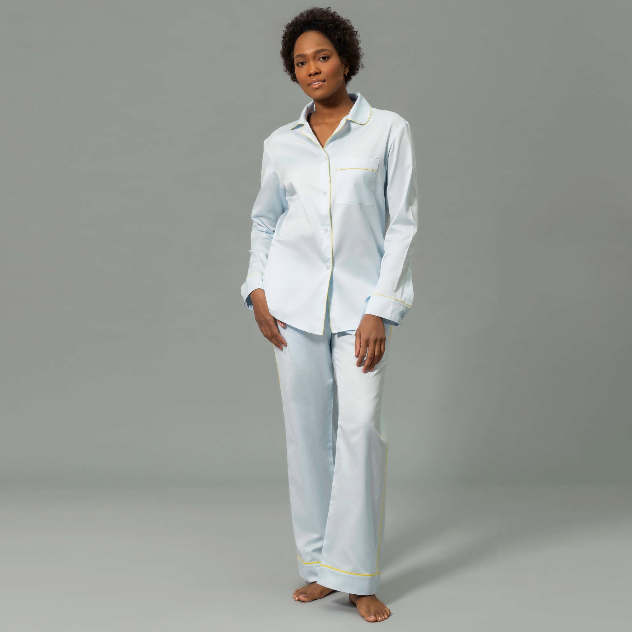 These pajamas bring the signature smooth luster of our Nocturne sateen sheeting to lightly tailored leisurewear. Finished with elegant piped details, the top features corozo buttons and a scooped hem. The trousers are a drawstring style with a touch of elastic in the back for extra comfort. Wear them to relax in style at home, or dress them up for days and nights out.