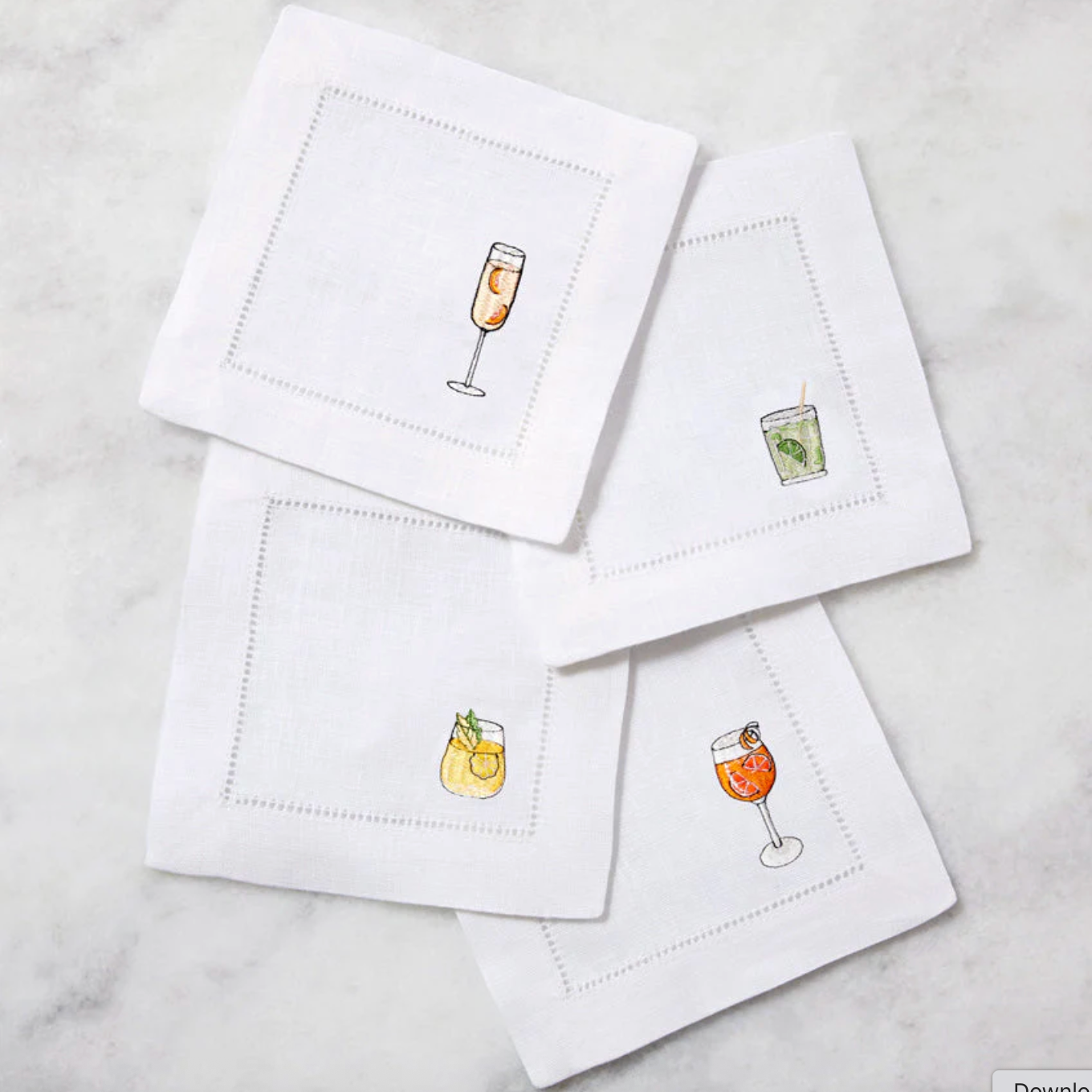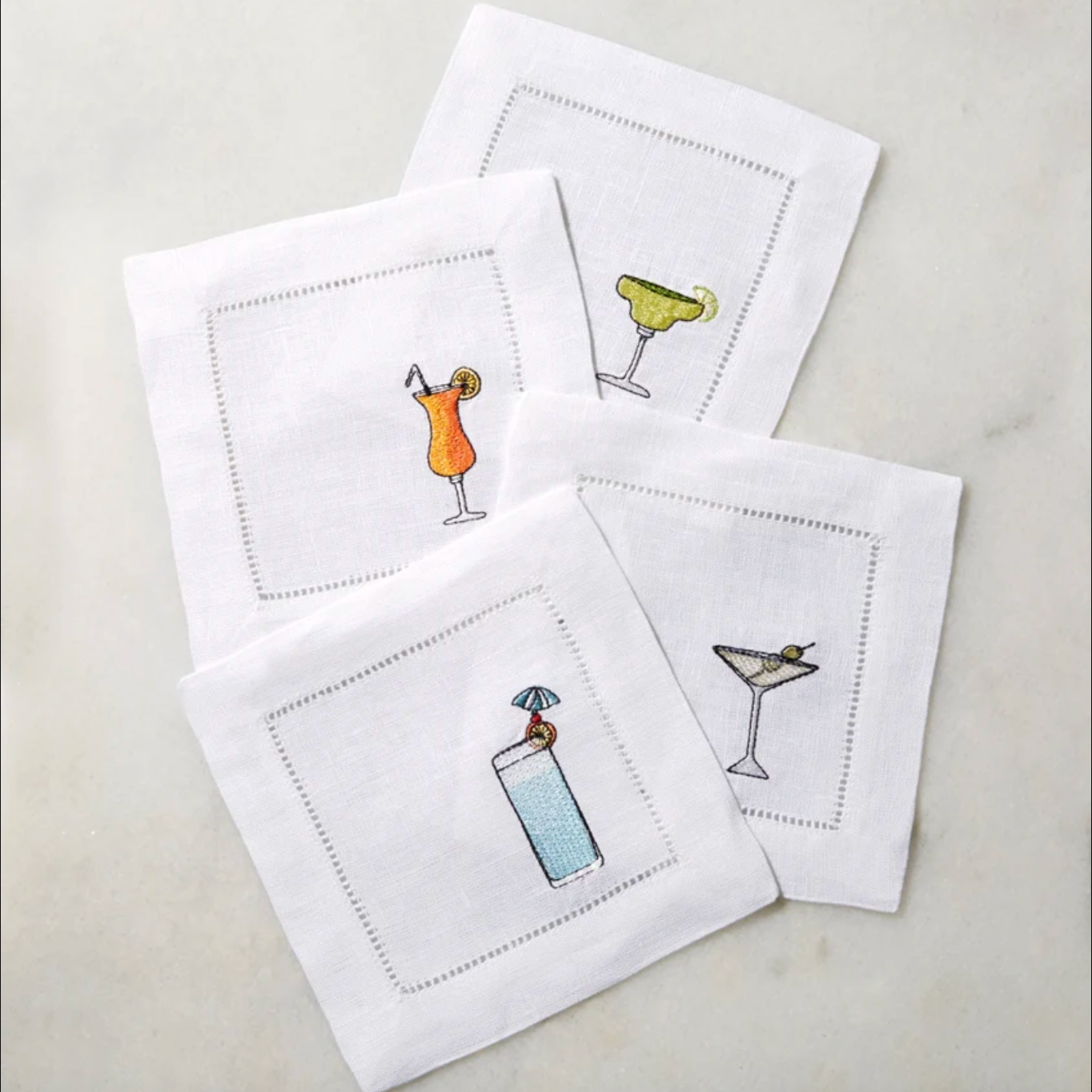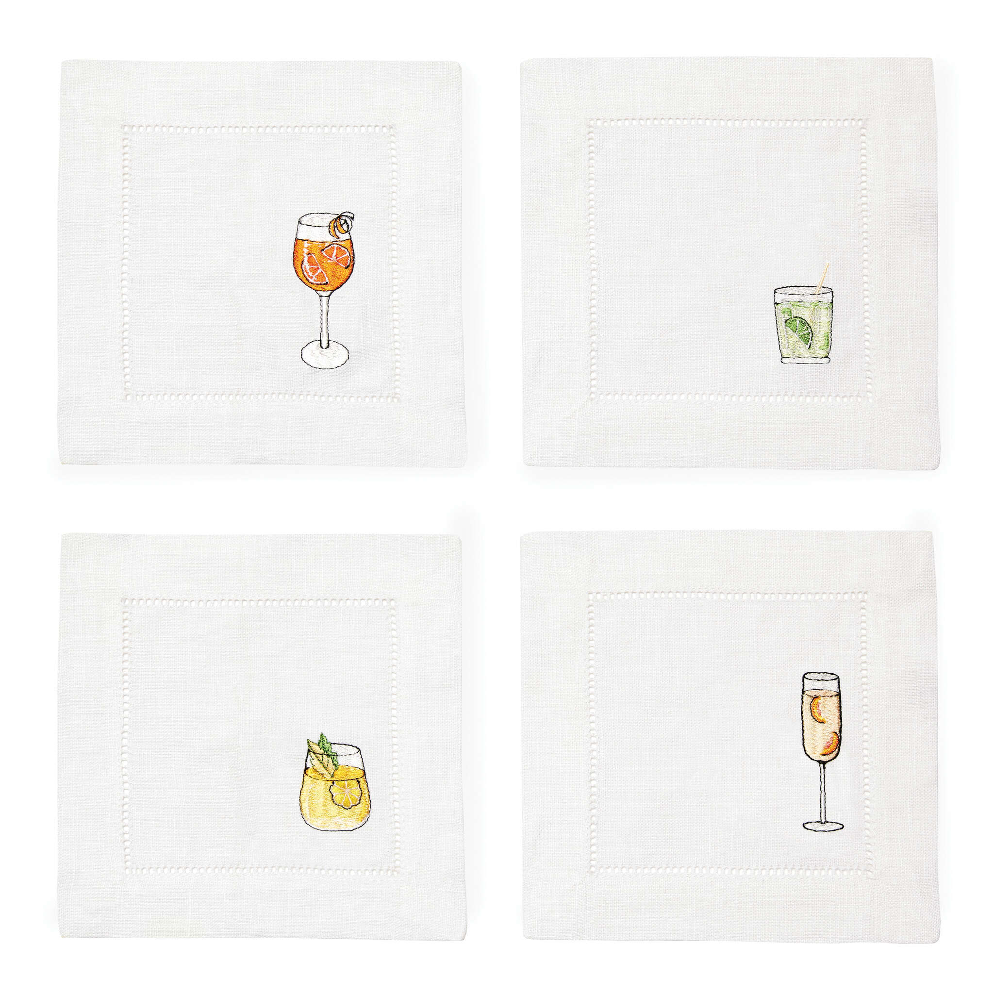 Nothing enlivens a social gathering more than Aperitivo, delightful cocktail napkins embroidered with classic libations savored in pre-dinner rituals all year long.