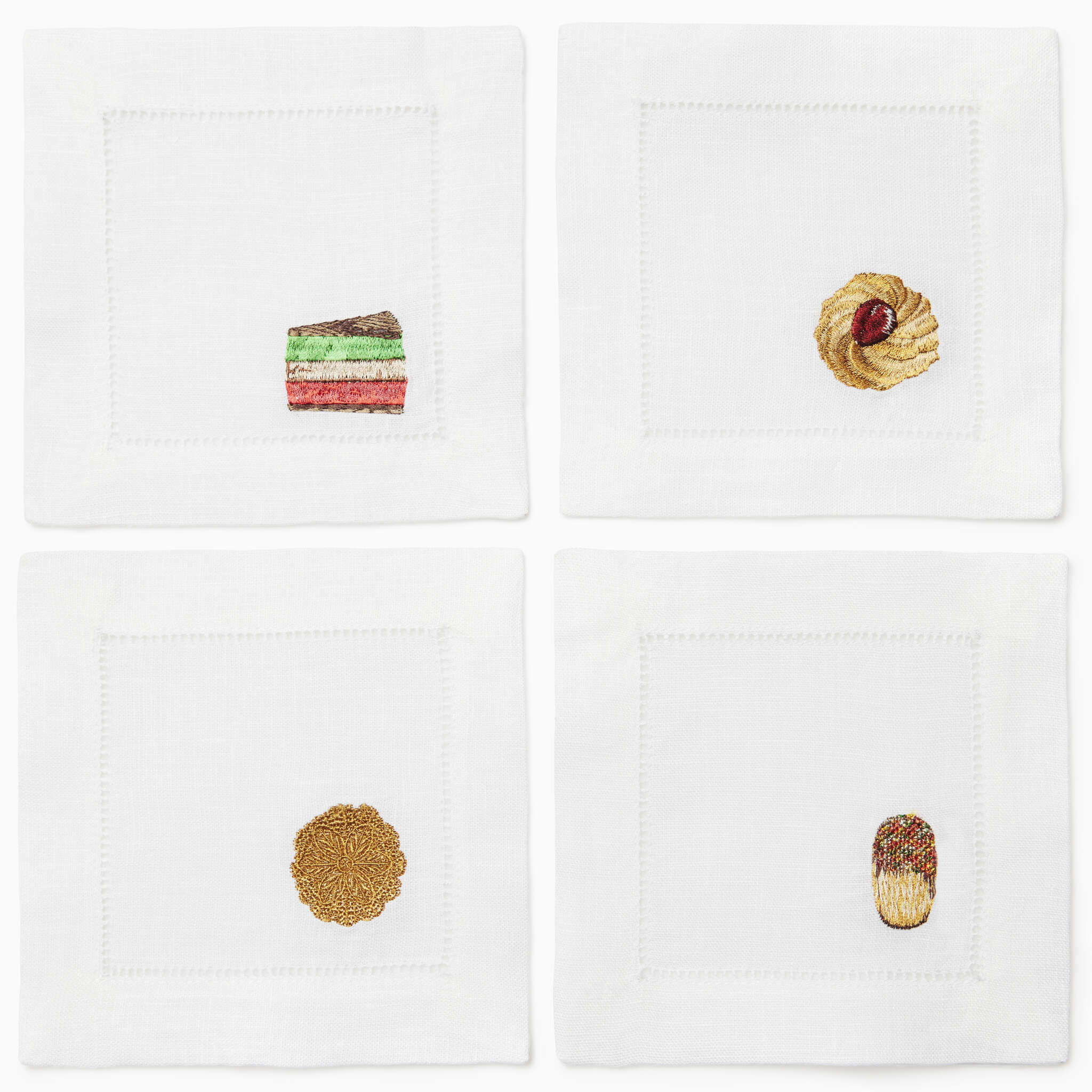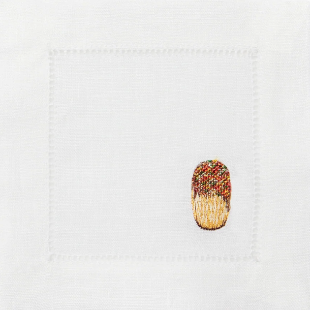 Elevate your gathering with elegant pure linen cocktail napkins, intricately embroidered with the beloved Venetian cookies, Biscotti di Mandorla, Italian butter cookies, and Pizzelle. These artistic designs evoke Italy's rich culinary heritage, mirroring the authentic flavors and textures of traditional treats. The Biscotto cocktail napkins celebrate Italy's timeless love for exquisite desserts and the joy of sharing them with loved ones
