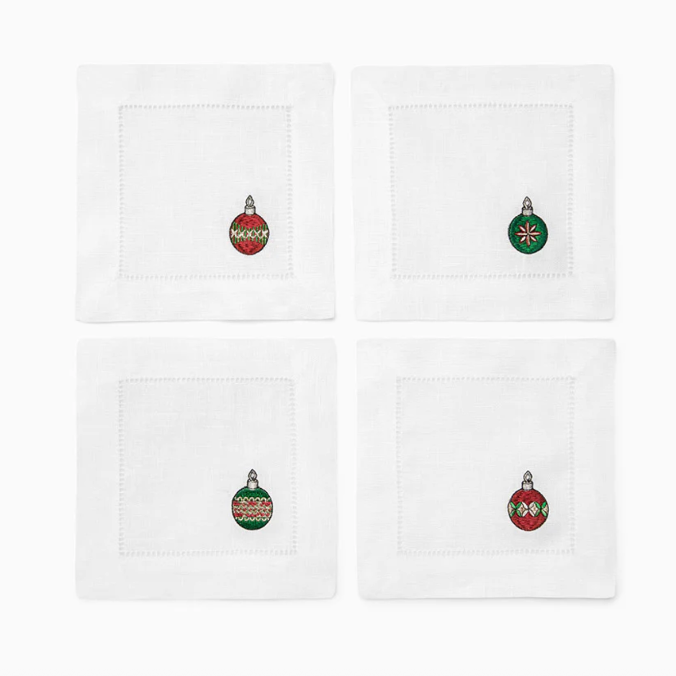 Deck the halls with our exquisite Bagattelle Christmas ornament cocktail napkins. These pure linen embroidered cocktail napkins are the perfect companion for festive drinks and appetizers, and are a stylish gift for any host during the holiday season.
