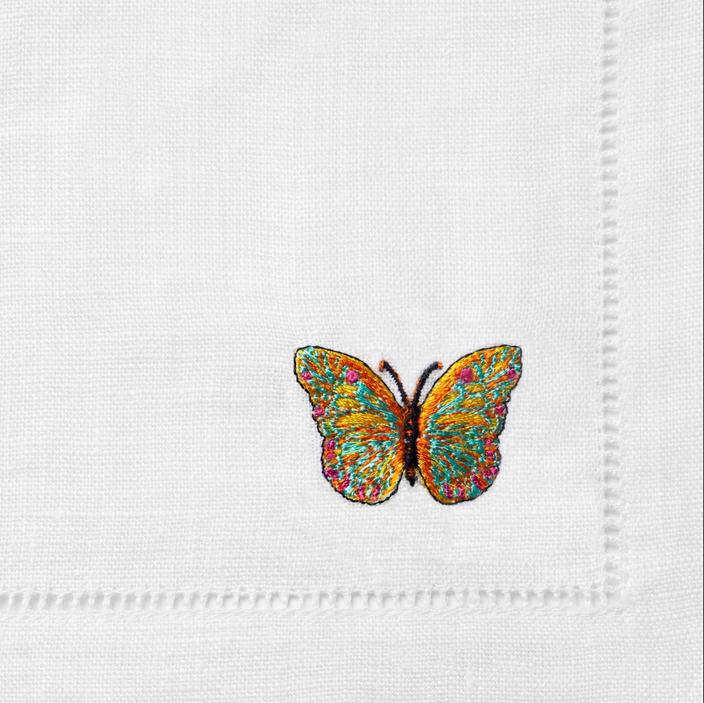 A set of four pure linen cocktail napkins, each adorned with a unique and exquisite butterfly embroidery, imbues any gathering with an air of sophistication and whimsy. The meticulous craftsmanship of the stitches beautifully encapsulates the ethereal grace and vibrant allure of these majestic butterflies.