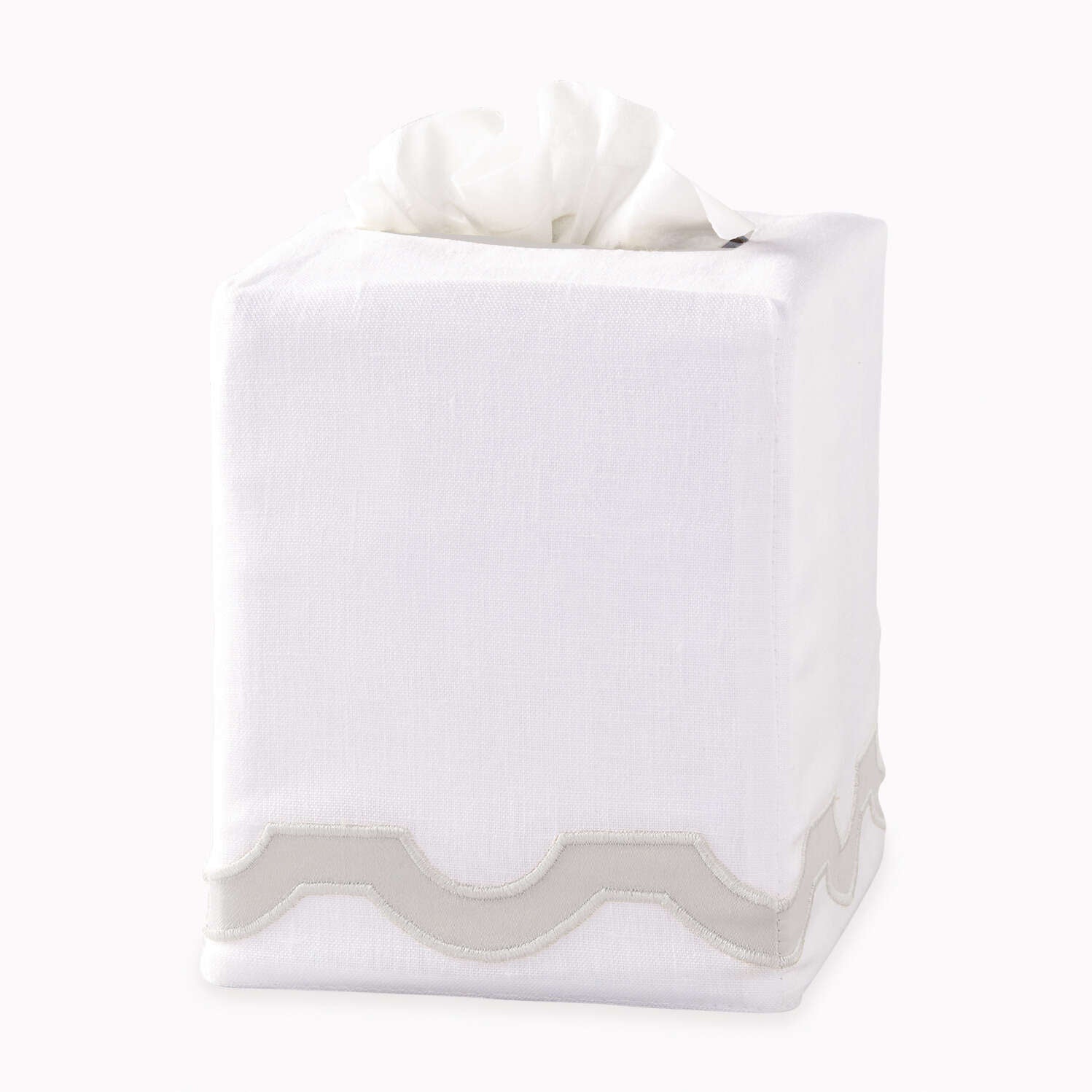 In 100% linen with a sateen appliqué trim, the Mirasol tissue box cover pairs with the top-selling bedding collection of the same name. In a home where no detail goes unconsidered, this playful and sophisticated style makes a beautiful addition to a bedroom or bathroom.